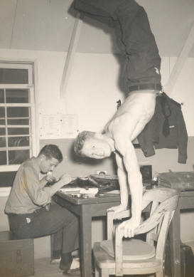 Barracks antics. My roommate is seen shining his shoes for inspection next day.