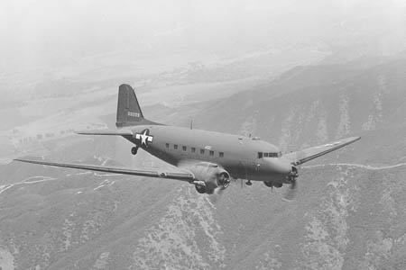 The C-47, DC-3, or "Sky Train," as the commercial models were known, is a remarkable airplane with a very long history. I think there are a few of them still in service. Notice that it has a tail wheel. Any airplane with a tail wheel is inherently more difficult to land than one with a nose wheel, because the center of gravity is behind the main landing gear. That causes two problems. One is that after landing, there is a tendency for the plane to make a violent turn called a ground loop, and the other is that if contact with the ground is made first (and abruptly) with the main landing gear, that causes a pitch-up which can send the plane back into the air just as it is stalling (losing flying speed).