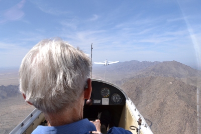 Here we are about 3,000 feet above ground (the altimeter is obscured, but we can tell from the white spot on the mountain), still hooked up. We released from tow at 4,000 feet.