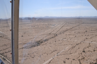 Turning onto final approach for landing. We will land on the unpaved strip to the right of the paved runway.